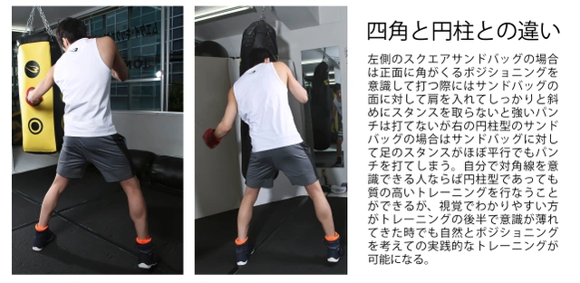 左側のスクエアサンドバッグの場合は正面に角がくるポジショニングを意識して打つ際にはサンドバッグの面に対して肩を入れてしっかりと斜めにスタンスを取らないと強いパンチは打てないが右の円柱型のサンドバッグの場合はサンドバッグに対して足のスタンスがほぼ平行でもパンチを打てしまう。自分で対角線を意識できる人ならば円柱型であっても質の高いトレーニングを行なうことができるが、視覚でわかりやすい方がトレーニングの後半で意識が薄れてきた時でも自然とポジショニングを考えての実践的なトレーニングが可能になる。