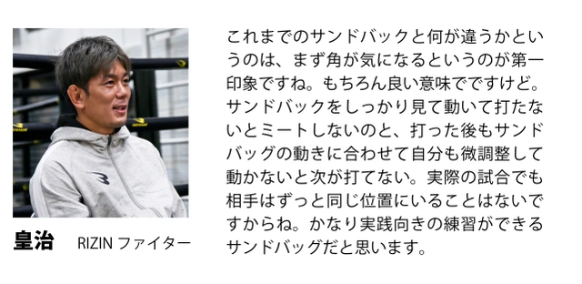 既存のサンドバッグでは打撃練習をする場合、微妙な角度を調整して打ち込むというよりは、打ちやすい角度で押し込む感覚に近い動作になりがちです。ダメージが面に対して垂直に伝わることで一撃の威力をアップさせるトレーニングとしてもこのスクエアサンドバッグは考えられて作られています。