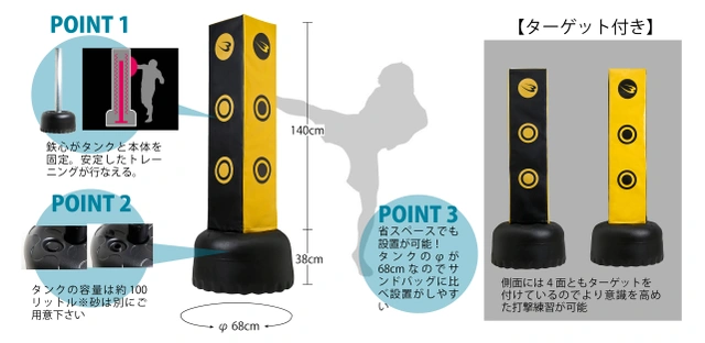 サンドバッグ型に比べ省スペースで設置しやすいスタンディングタイプ同時開発。こちらはサンドバッグ型に比べ振り子のように動きにくいので、サンドバッグタイプだと難しいと感じる方におすすめ。