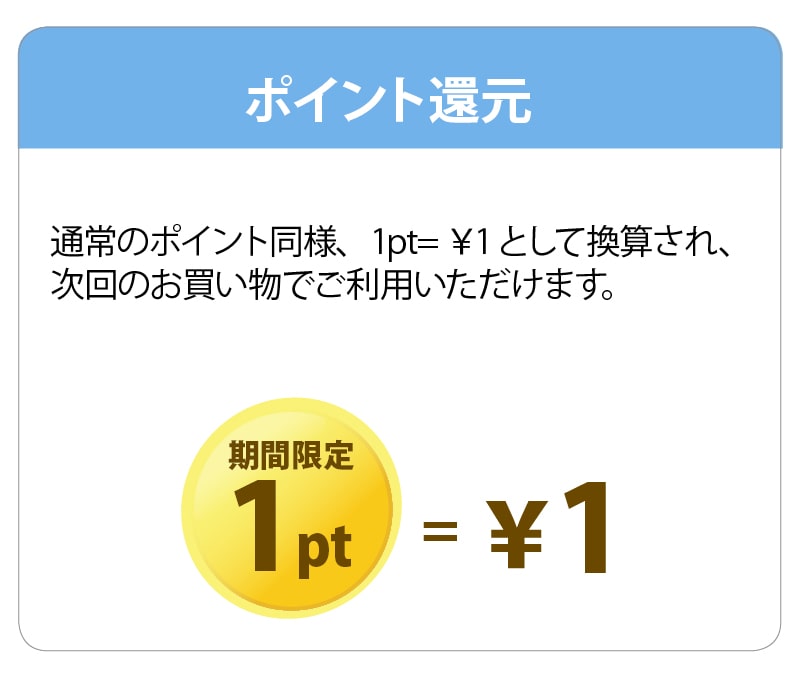 会員は、1ポイントを1円に換算し、商品購入時の支払い金額の一部もしくは、全てに充当することができます。 (一度退会し、再登録した場合は発行されません。また、退会すると所持ポイントは失効します。)